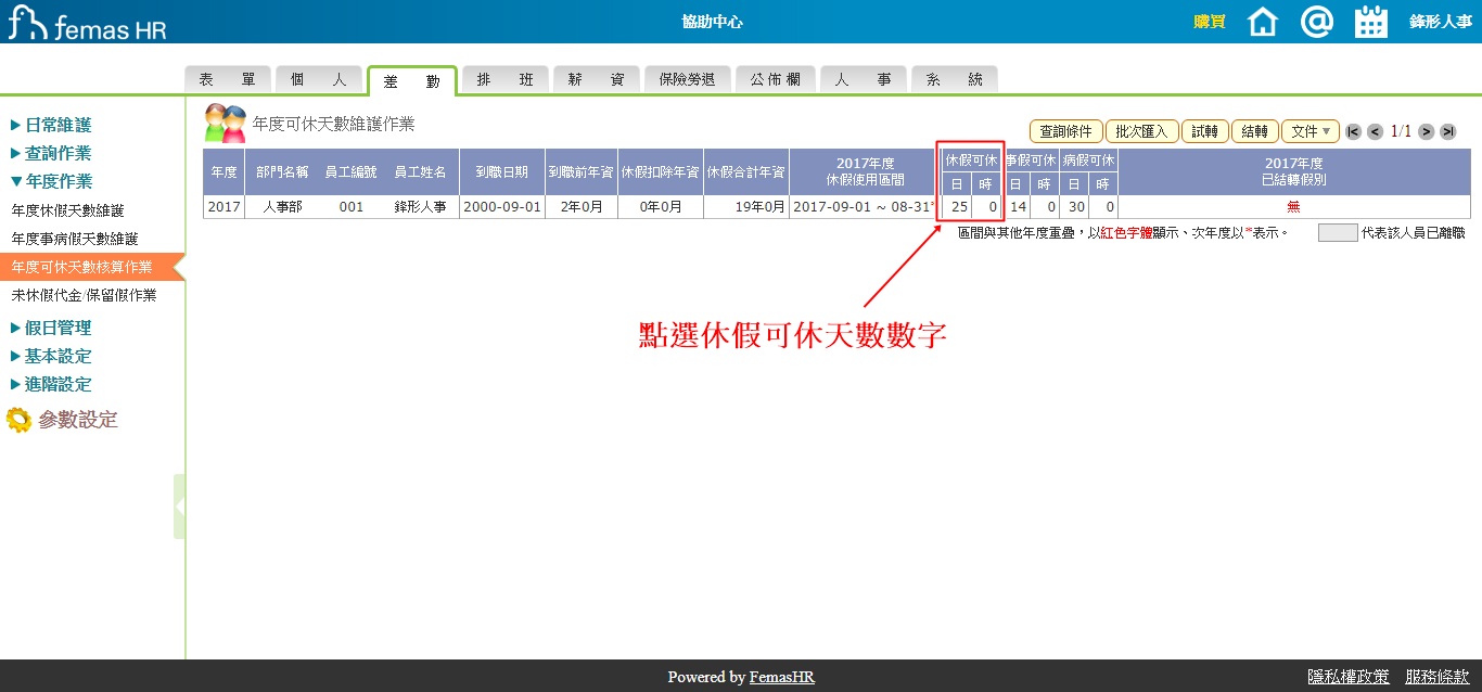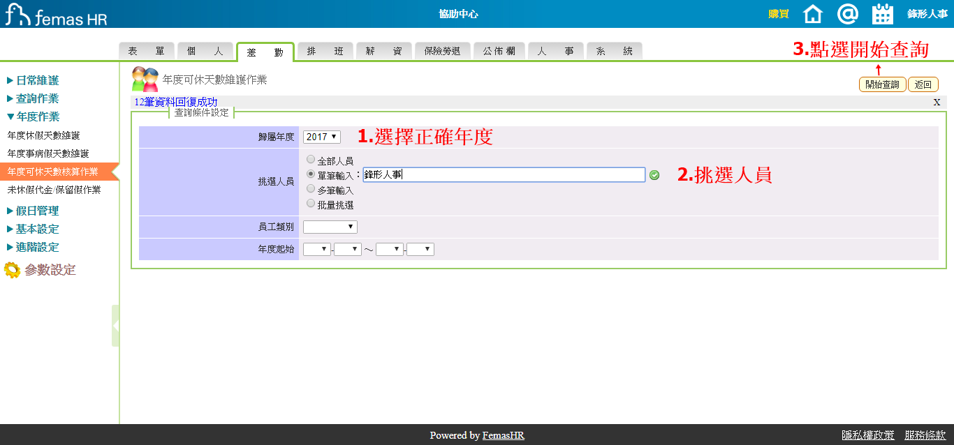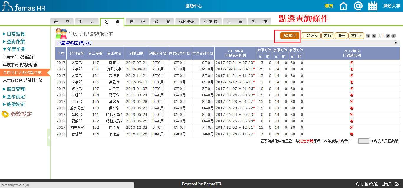 請至差勤>>年度作業>>年度可休天數核算作業>>點選查詢條件。